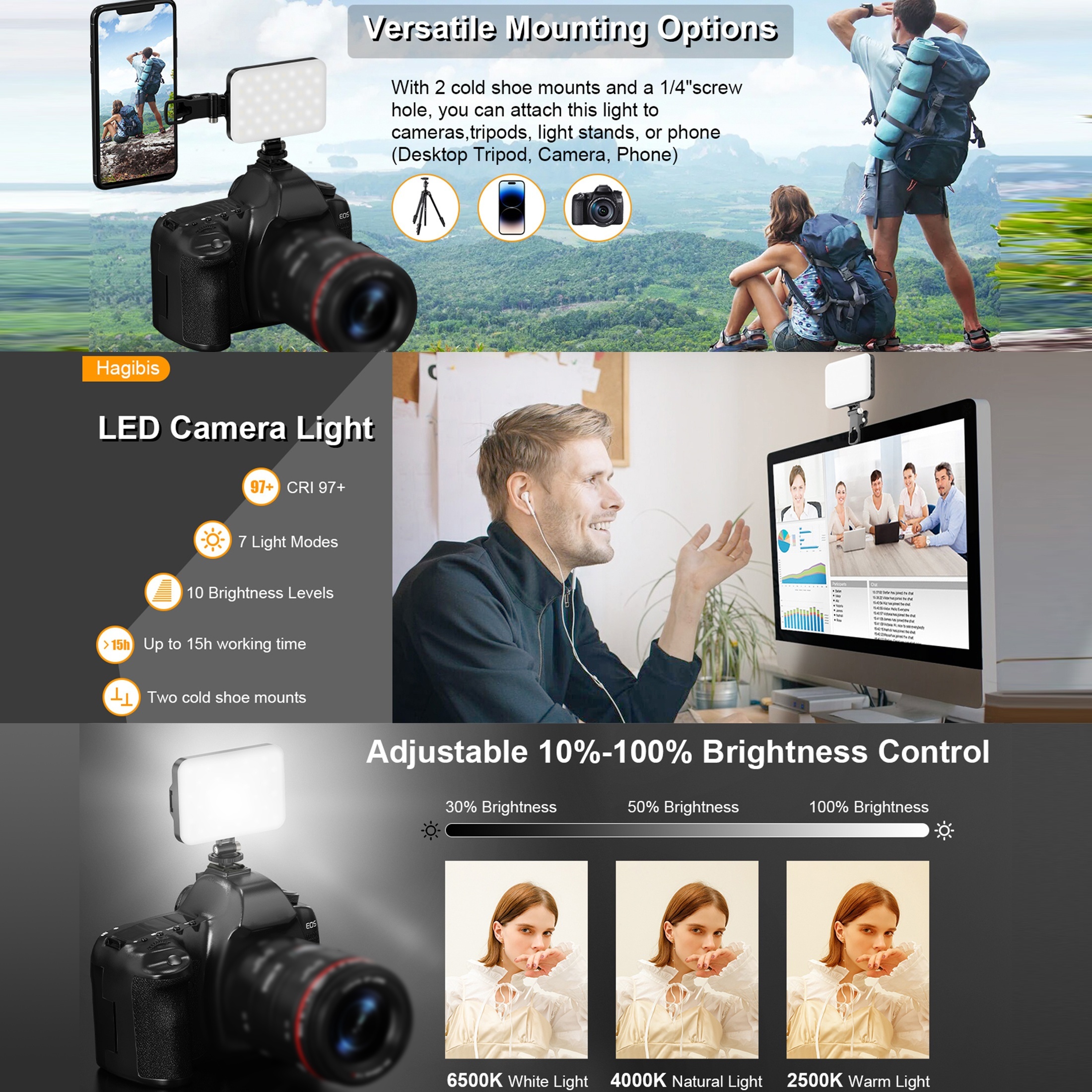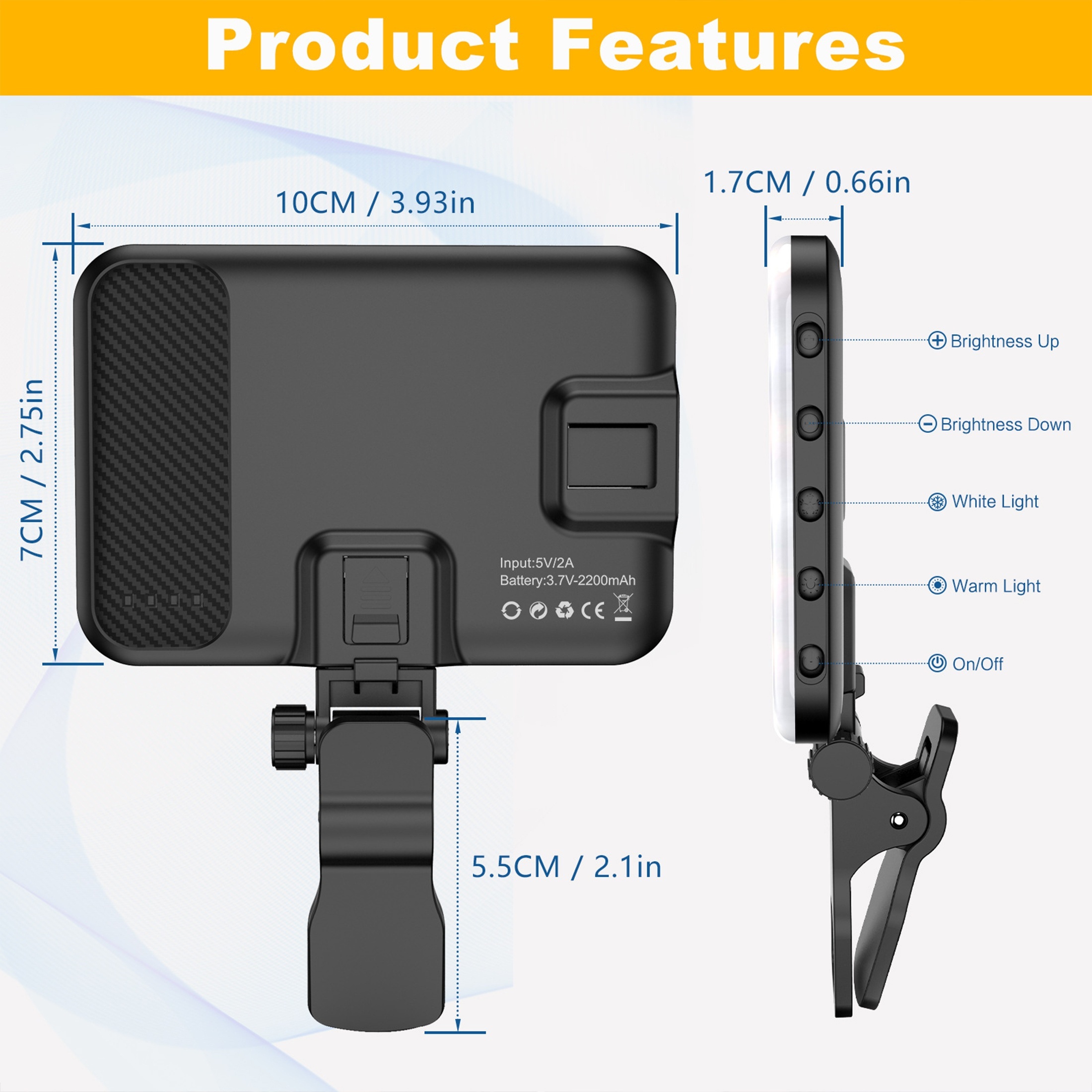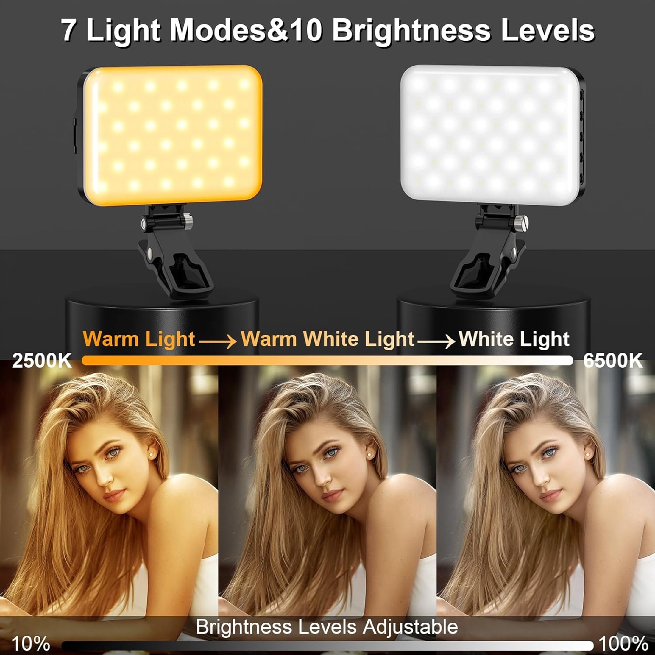 60 LED Portable Clip-On Video Light with 2200mAh Rechargeable, 7 Lighting Modes & 10-Level Dimmer, - Selfie Light for iPhone//DSLR/Action Cameras, Vlogging, YouTube Recording, Smartphones & Tablets