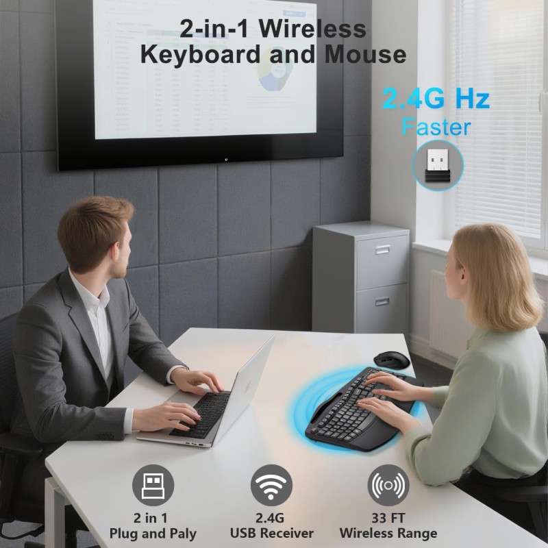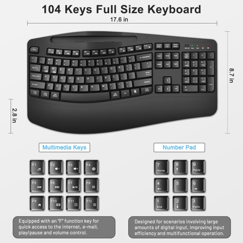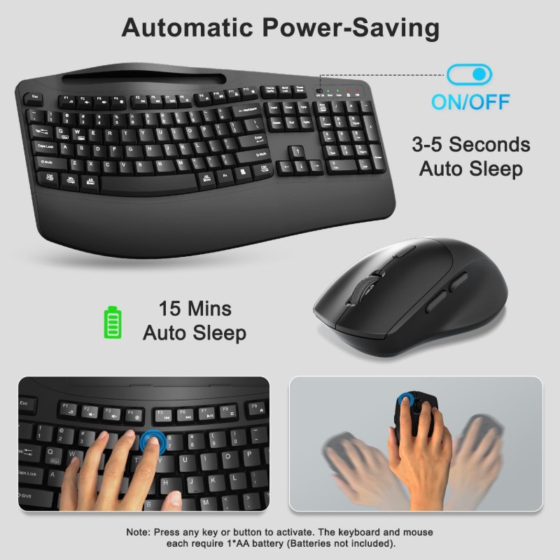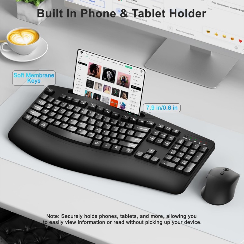 Wireless Keyboard and Mouse Combo 2 4G Full Size Wave Keys Ergonomic Keyboard with Wrist Rest Phone Holder 3 Level DPI Wireless Silent Mouse with 6 Buttons for Windows Mac OS Laptop PC Black