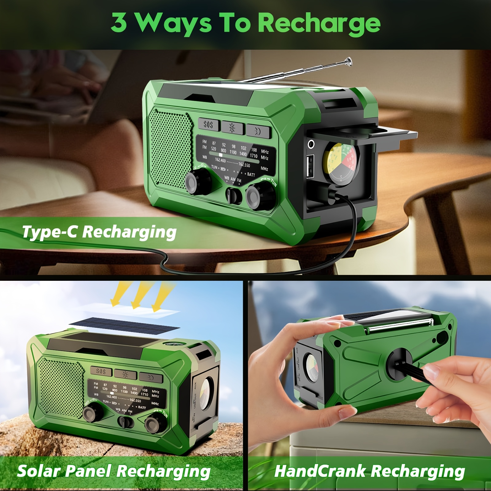 36800mwh 1 pack Emergency Radios for Families with AM/FM, 3-Way Charging (Hand Crank/Solar/USB), Kid-Friendly SOS Alarm, Flashlight, Reading Light, Thermometer, Compass & 10000mAh Power Bank - Peace of Mind for Every Home